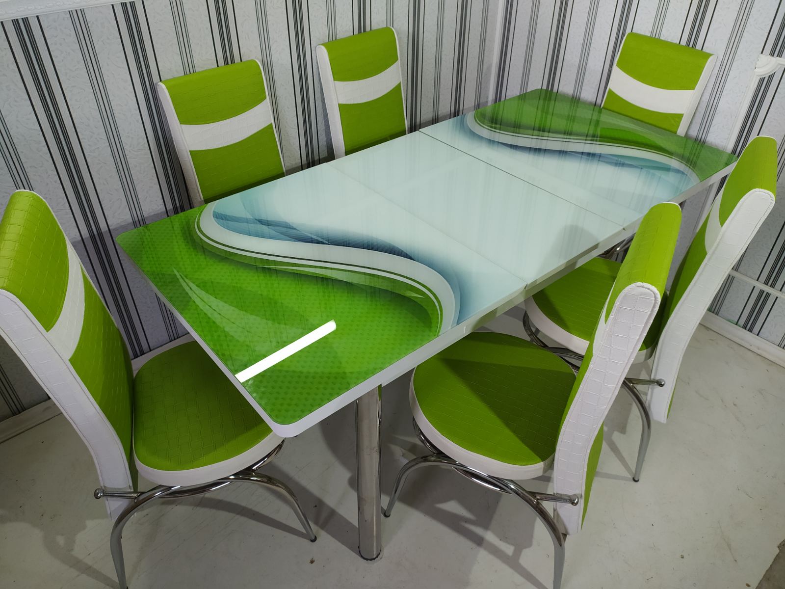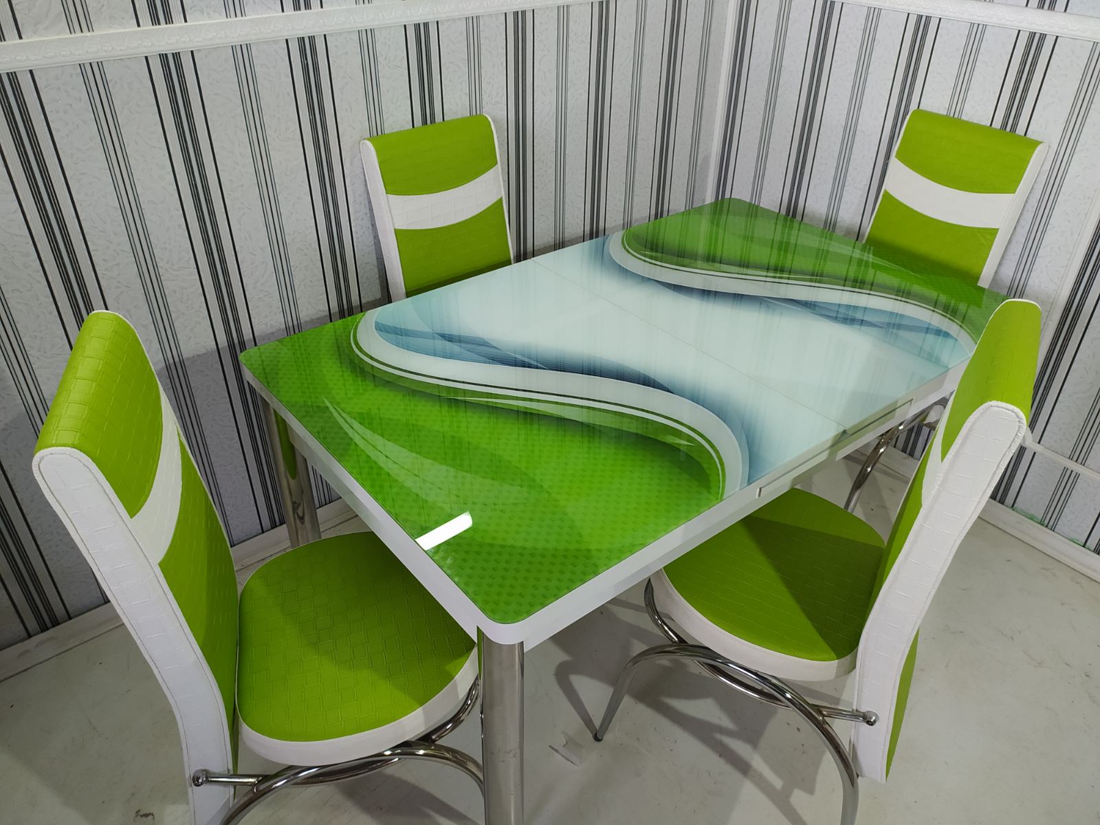 Турецький обідній розкладний 3D стіл на 4 стільці з гартованого скла дерев'яний каркас
