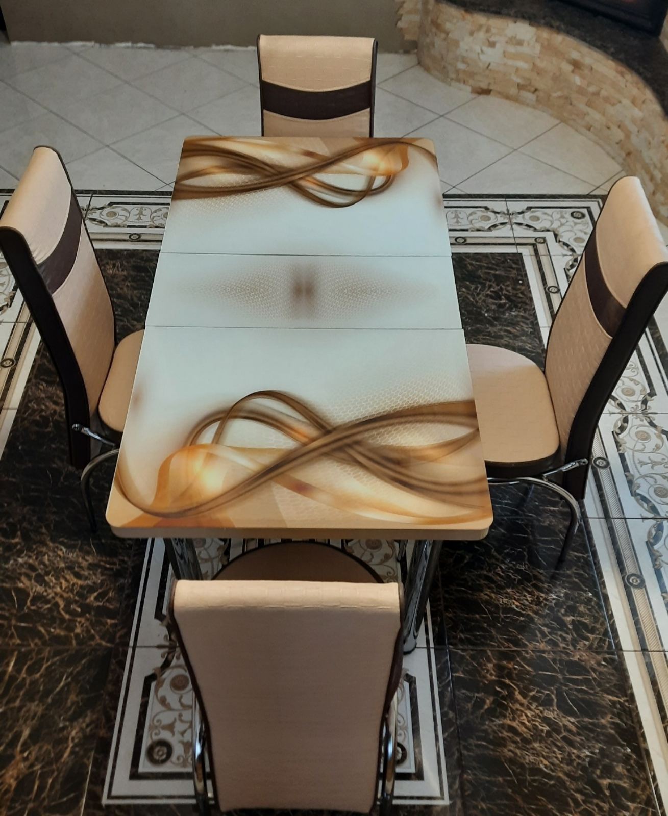 Турецький обідній розкладний 3D стіл на 4 стільці з гартованого скла дерев'яний каркас