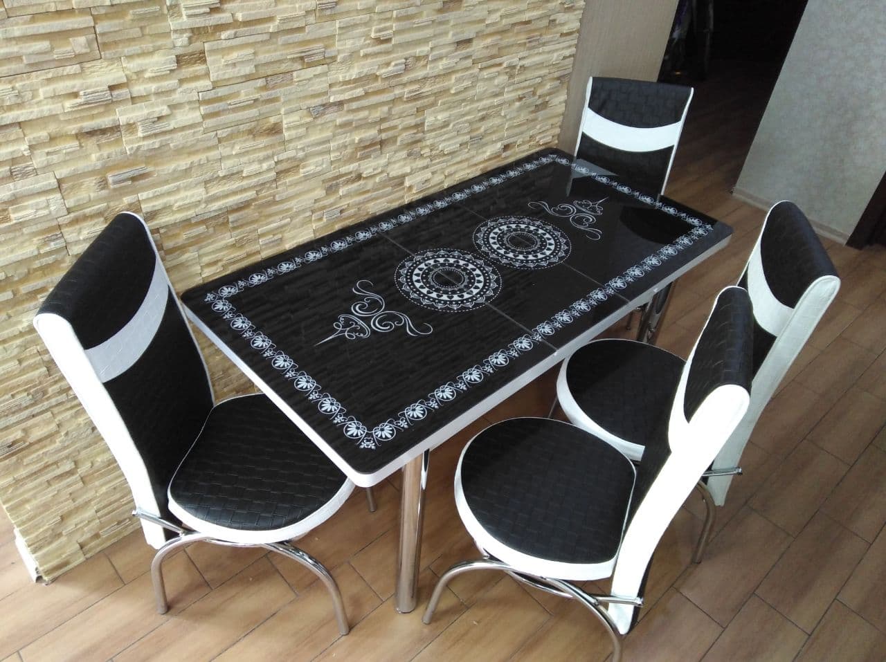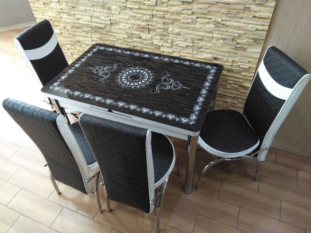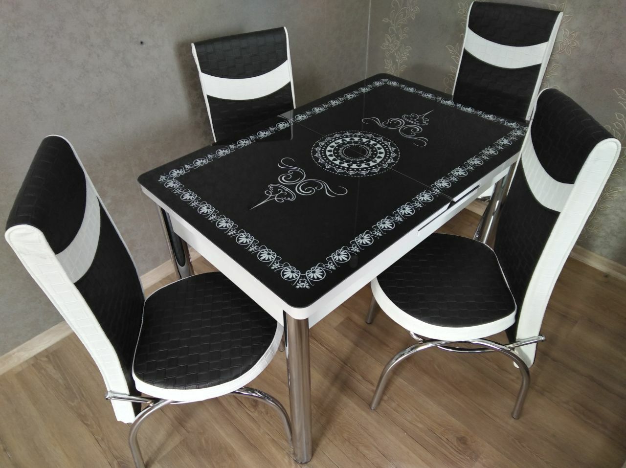 Турецький обідній розкладний 3D стіл на 4 стільці з гартованого скла металевий каркас