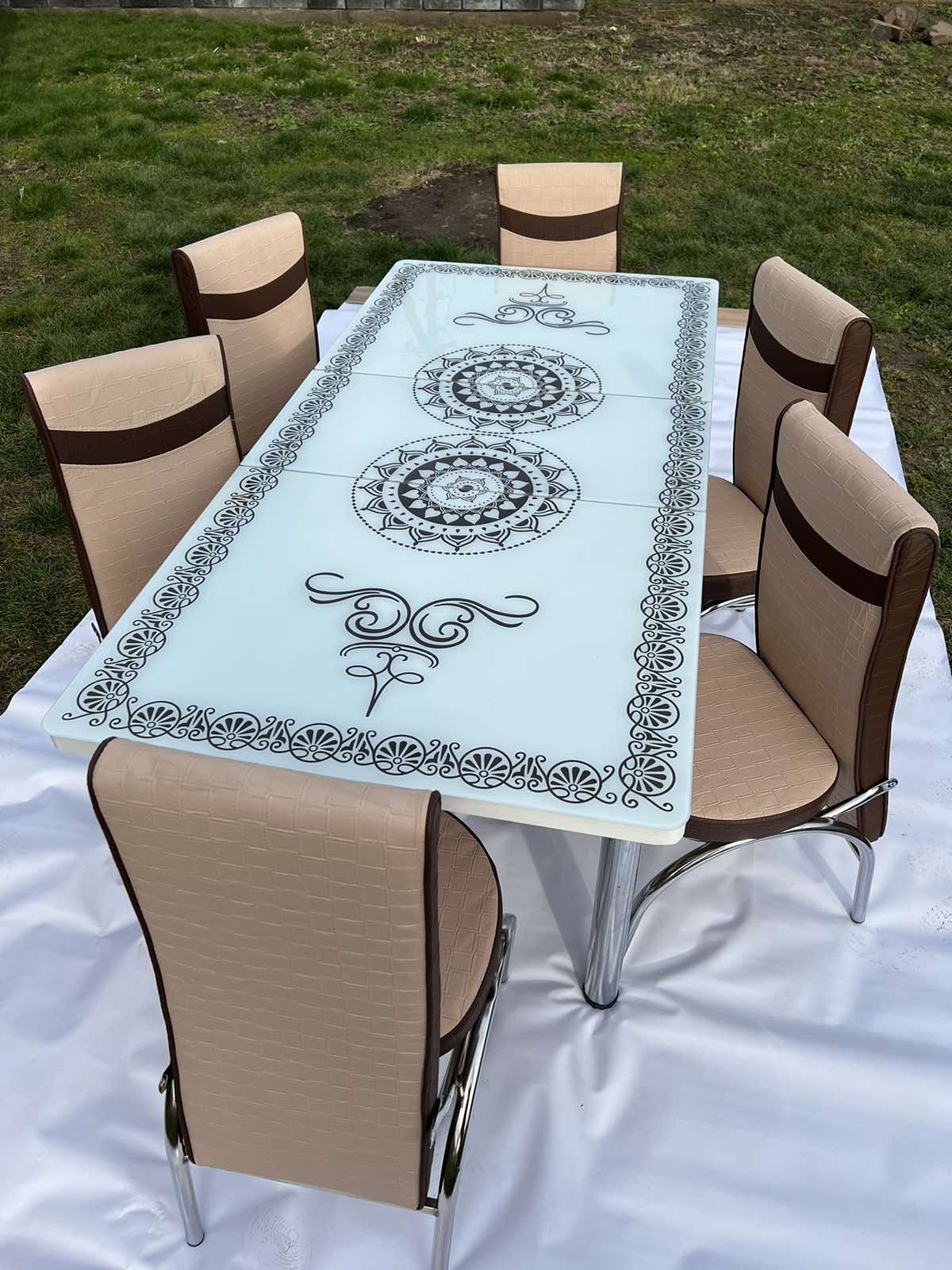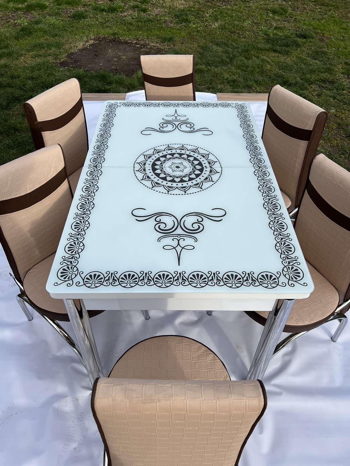 Турецький обідній розкладний 3D стіл на 4 стільці з гартованого скла металевий каркас