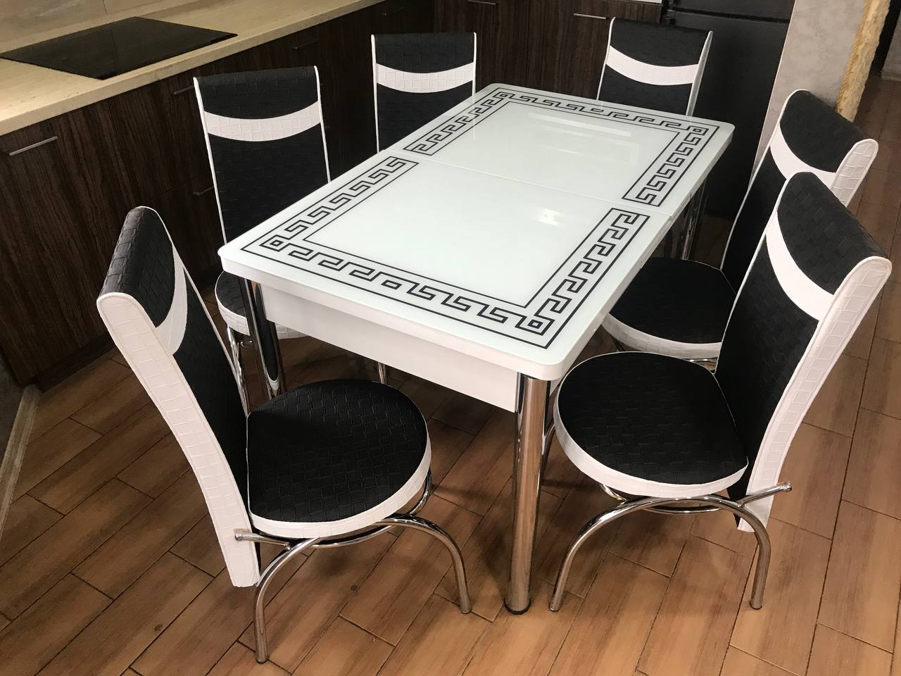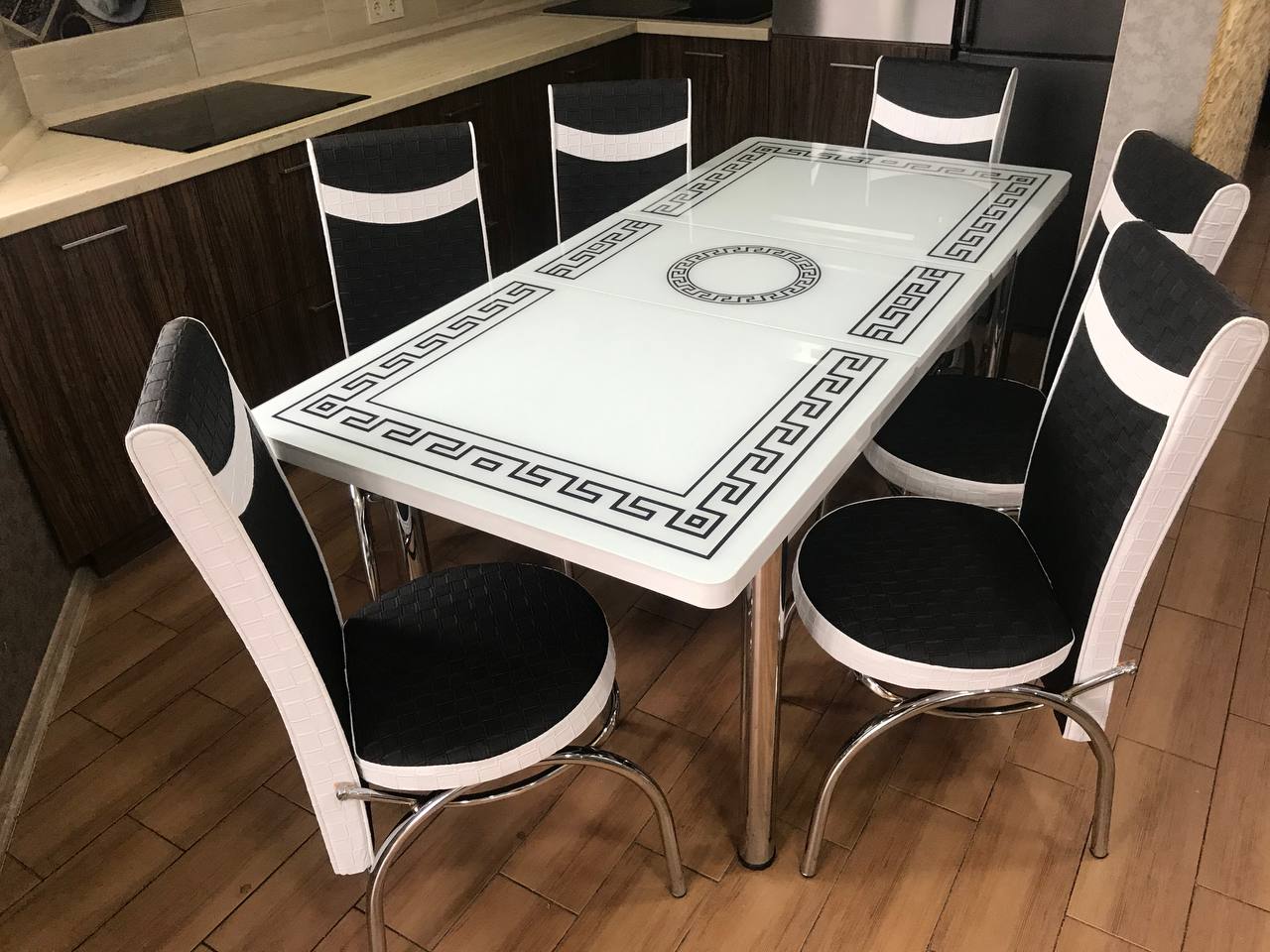 Турецький обідній розкладний 3D стіл та 6 стільців з гартованого скла дерев'яний каркас