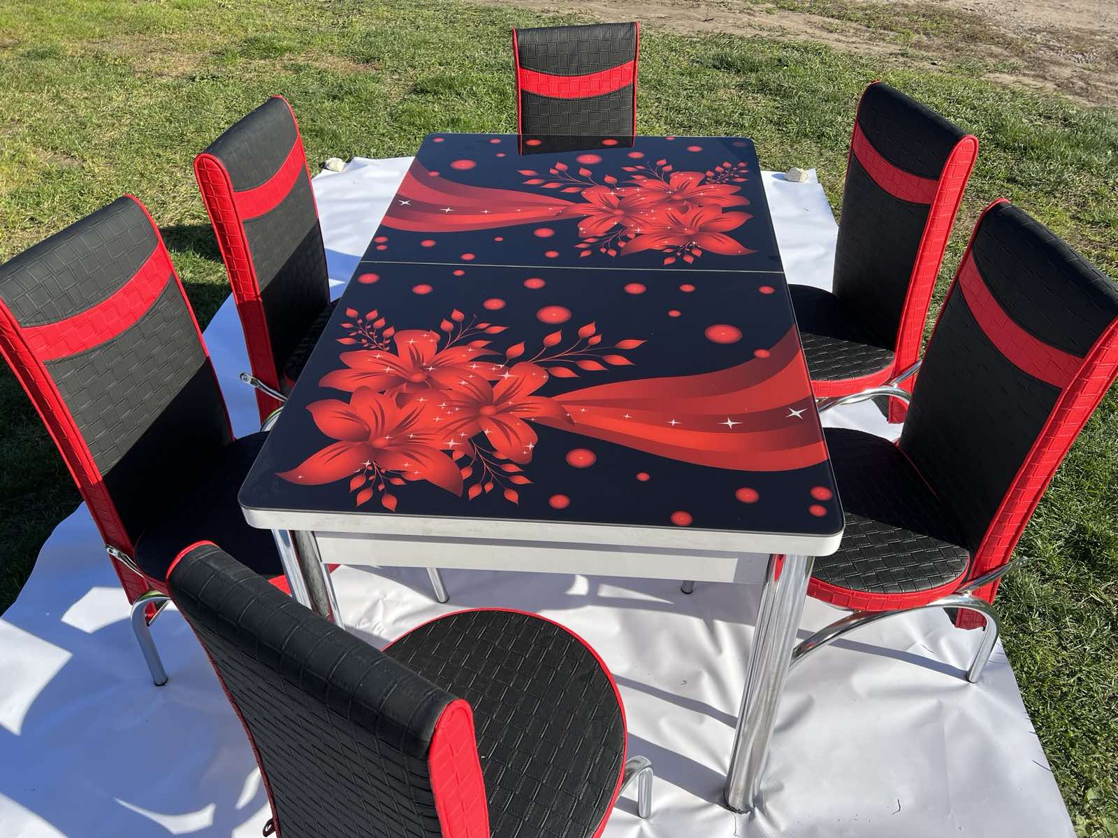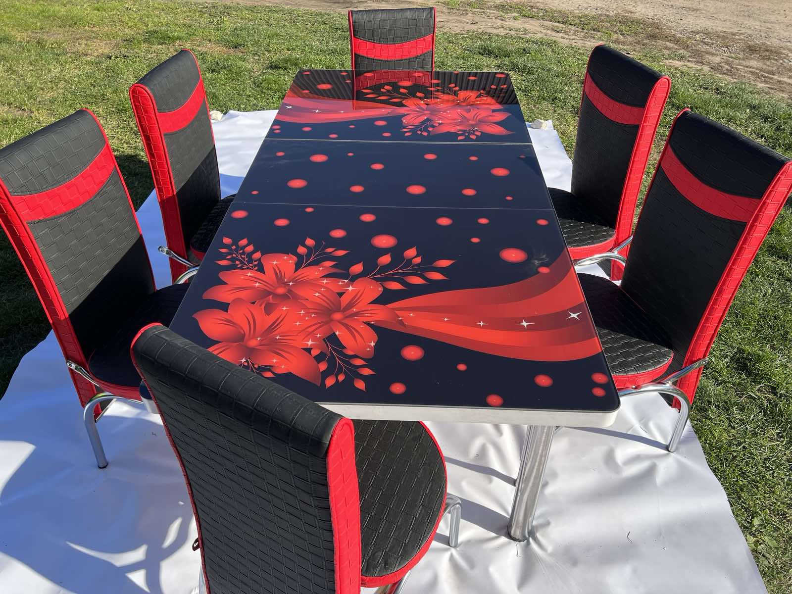 Турецький обідній розкладний 3D стіл з гартованого скла та 6 стільців