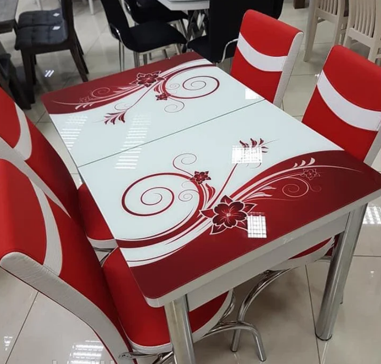Турецький обідній розкладний 3D стіл та 6 стільців з гартованого скла металевий каркас