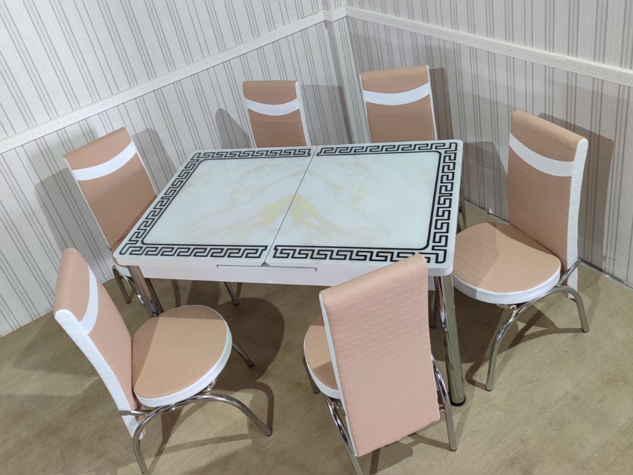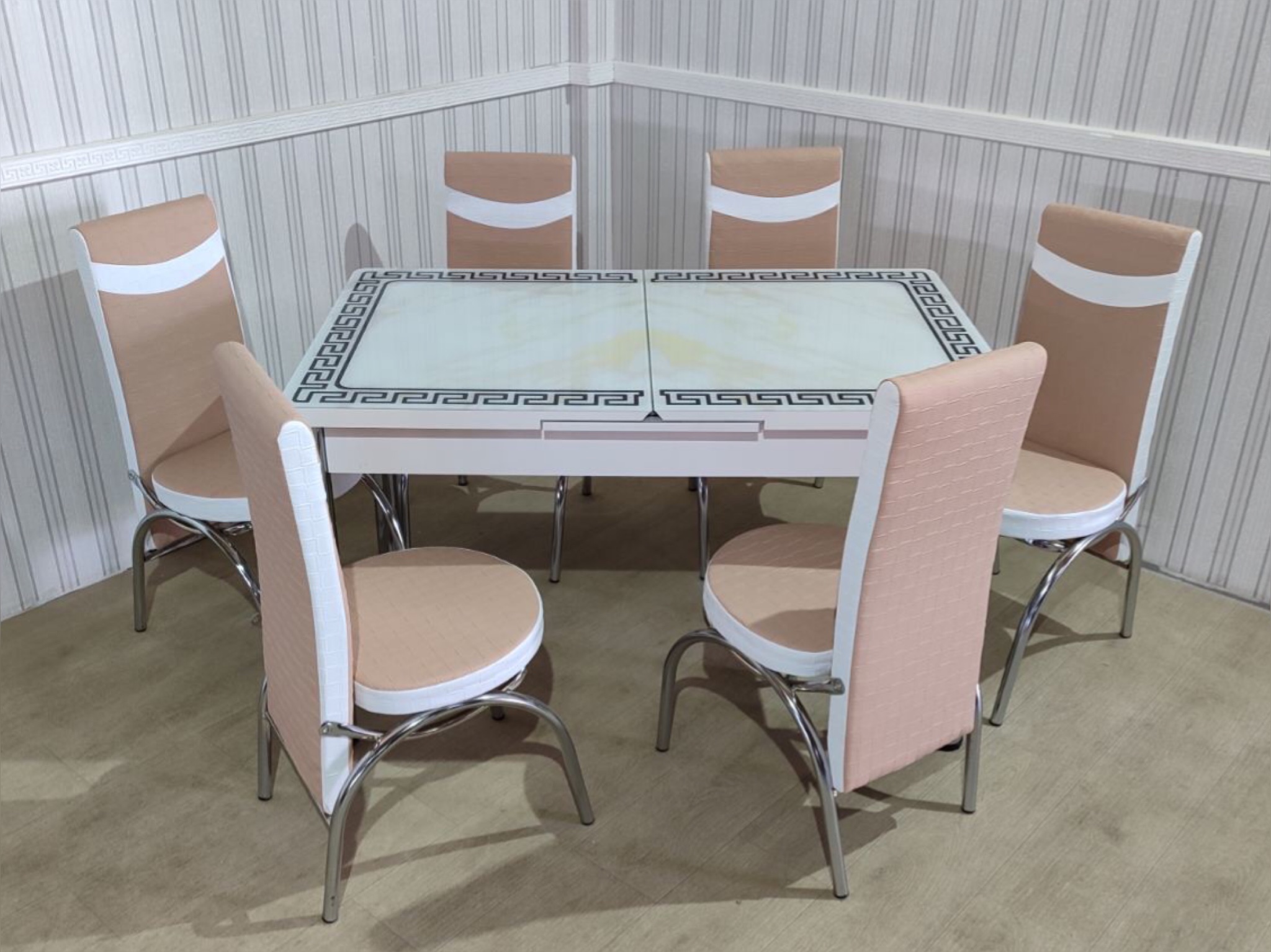 Турецький обідній розкладний 3D стіл та 6 стільців з гартованого скла дерев'яний каркас