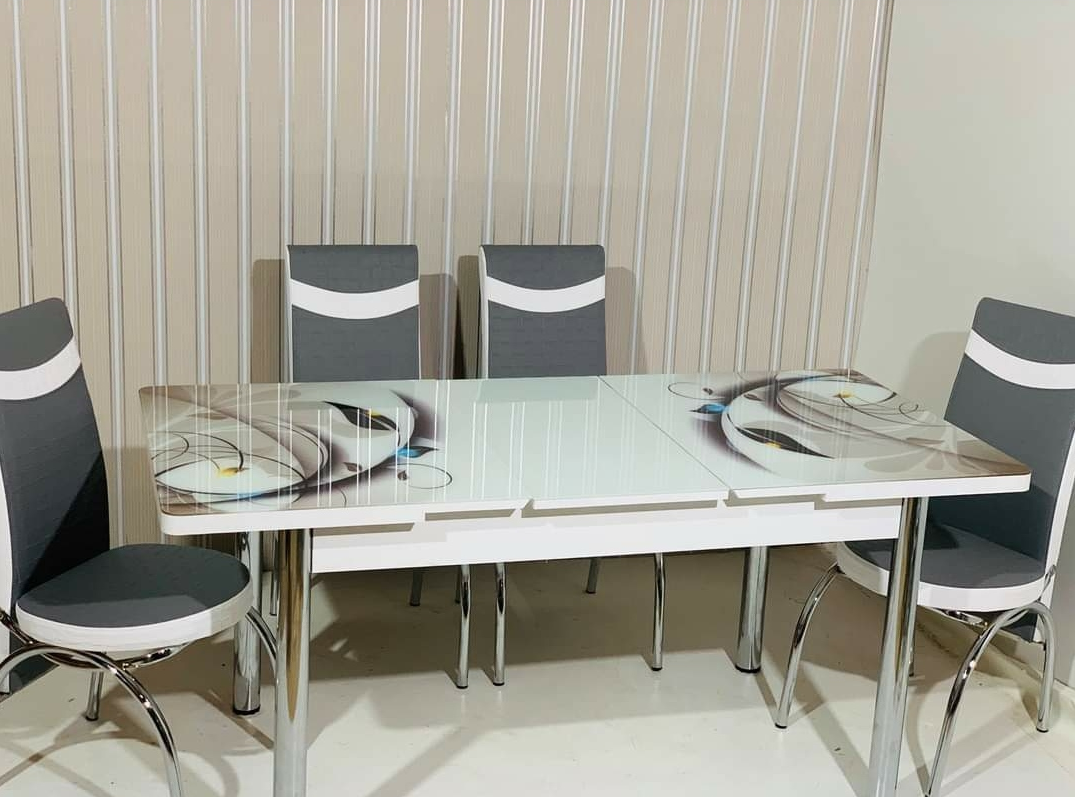 Турецький обідній розкладний 3D стіл та 6 стільців з гартованого скла дерев'яний каркас