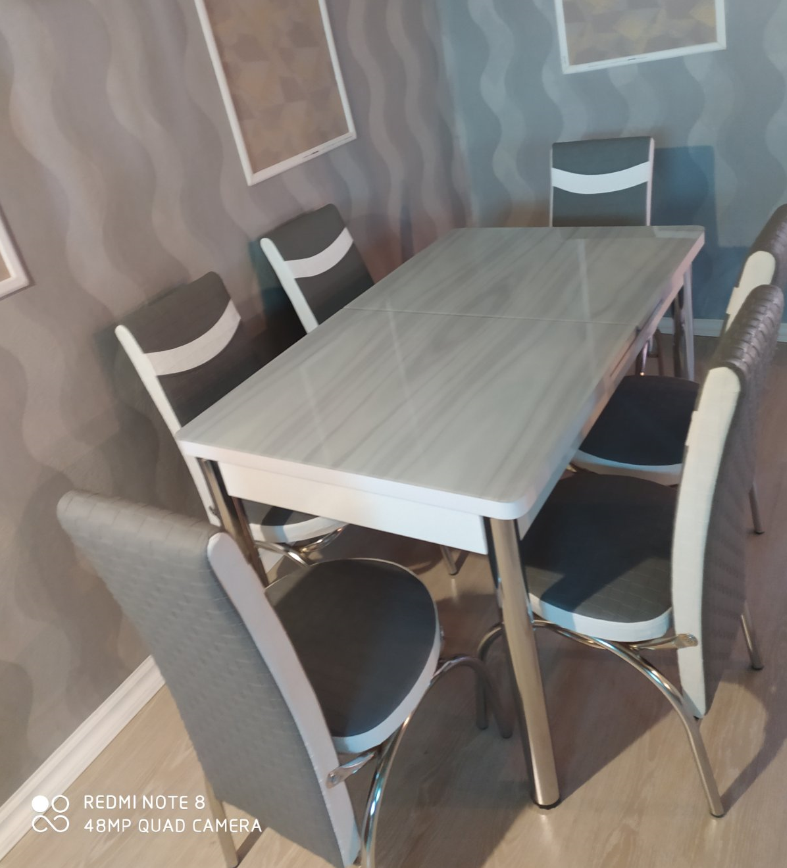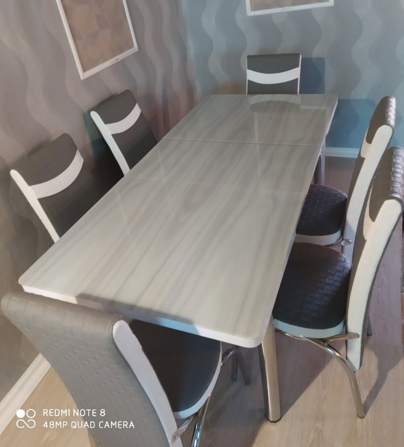 Турецький обідній розкладний 3D стіл з гартованого скла та 6 стільців