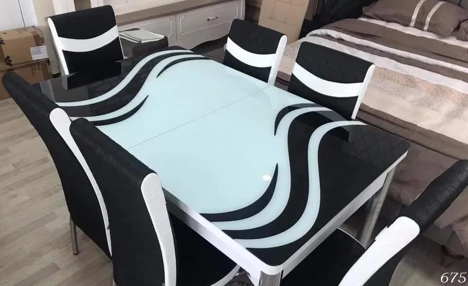 Турецький обідній розкладний 3D стіл та 6 стільців з гартованого скла дерев'яний каркас