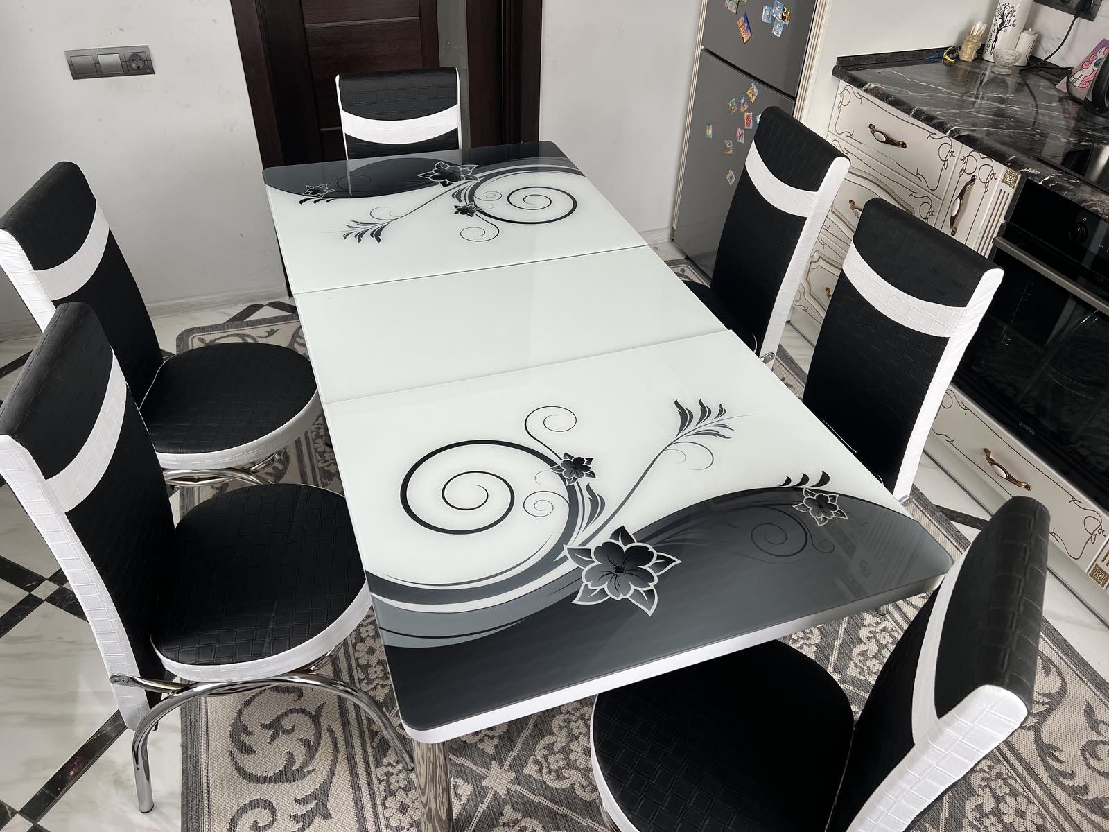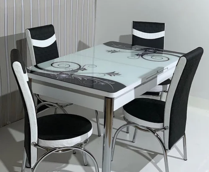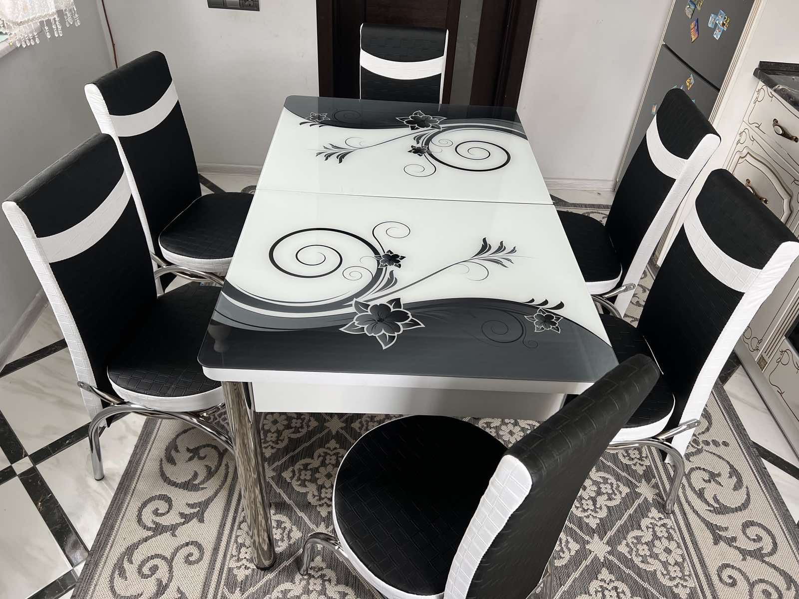 Турецький обідній розкладний 3D стіл та 6 стільців з гартованого скла металевий каркас