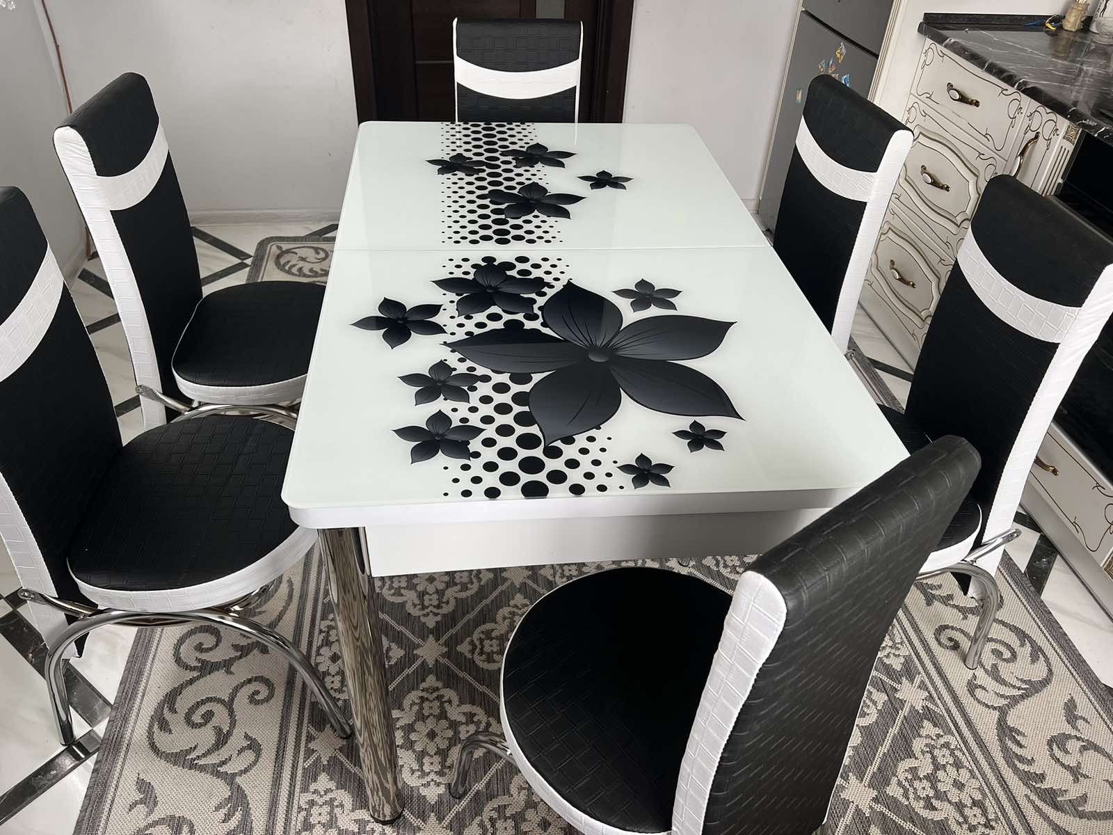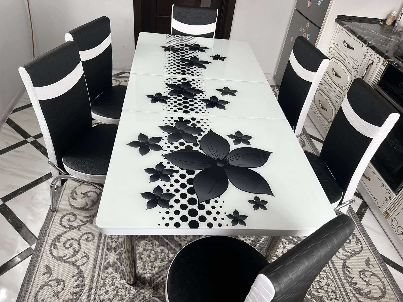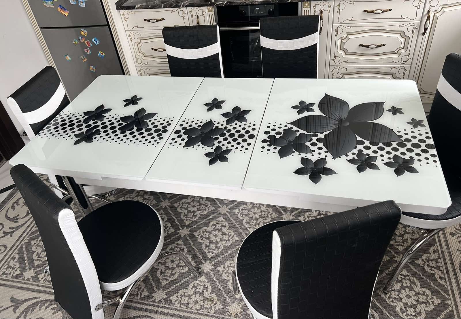 Турецький обідній розкладний 3D стіл та 6 стільців з гартованого скла дерев'яний каркас