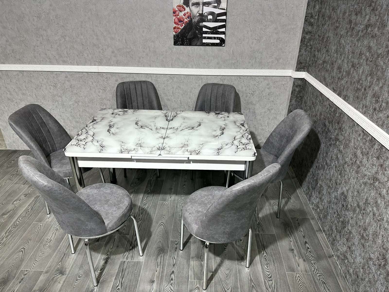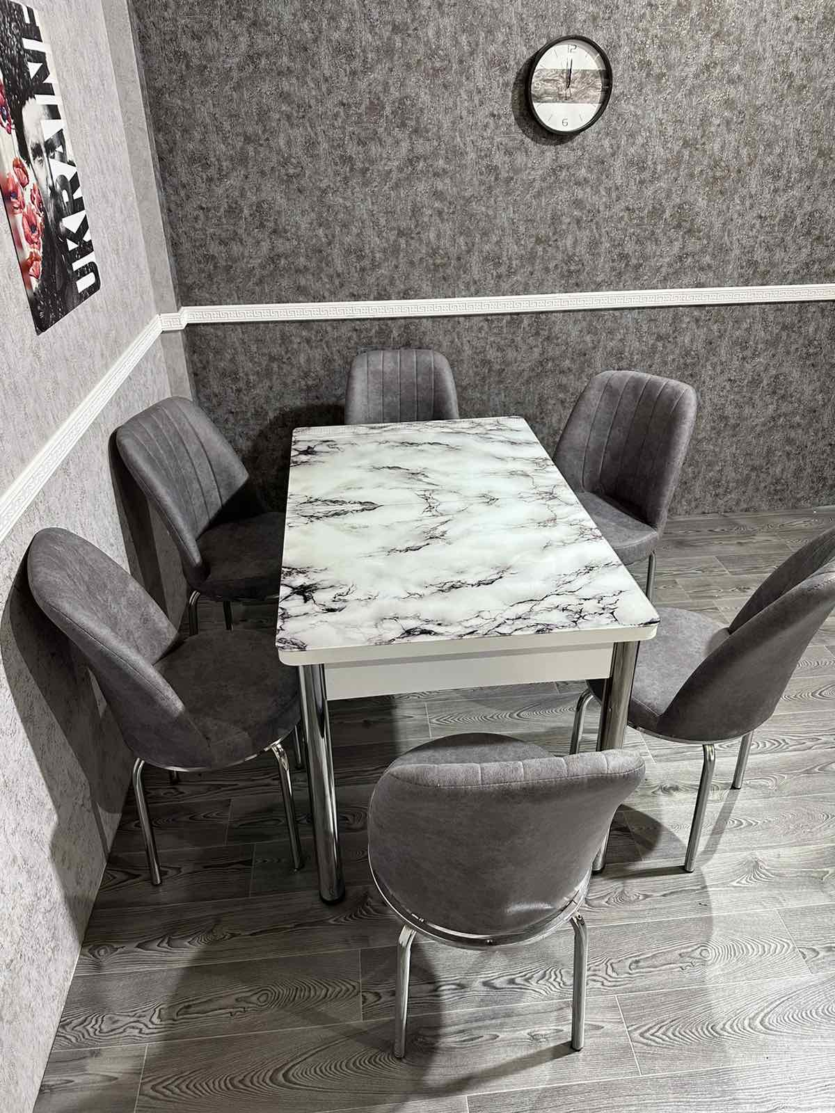 Турецький обідній розкладний 3D стіл та 6 стільців з гартованого скла дерев'яний каркас