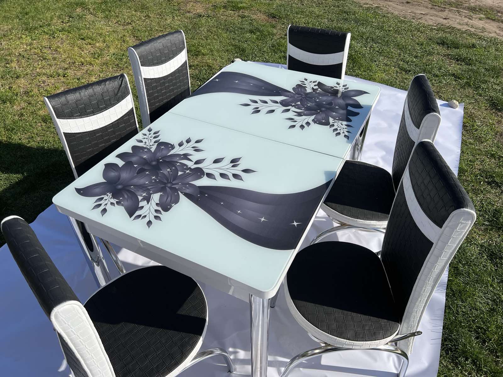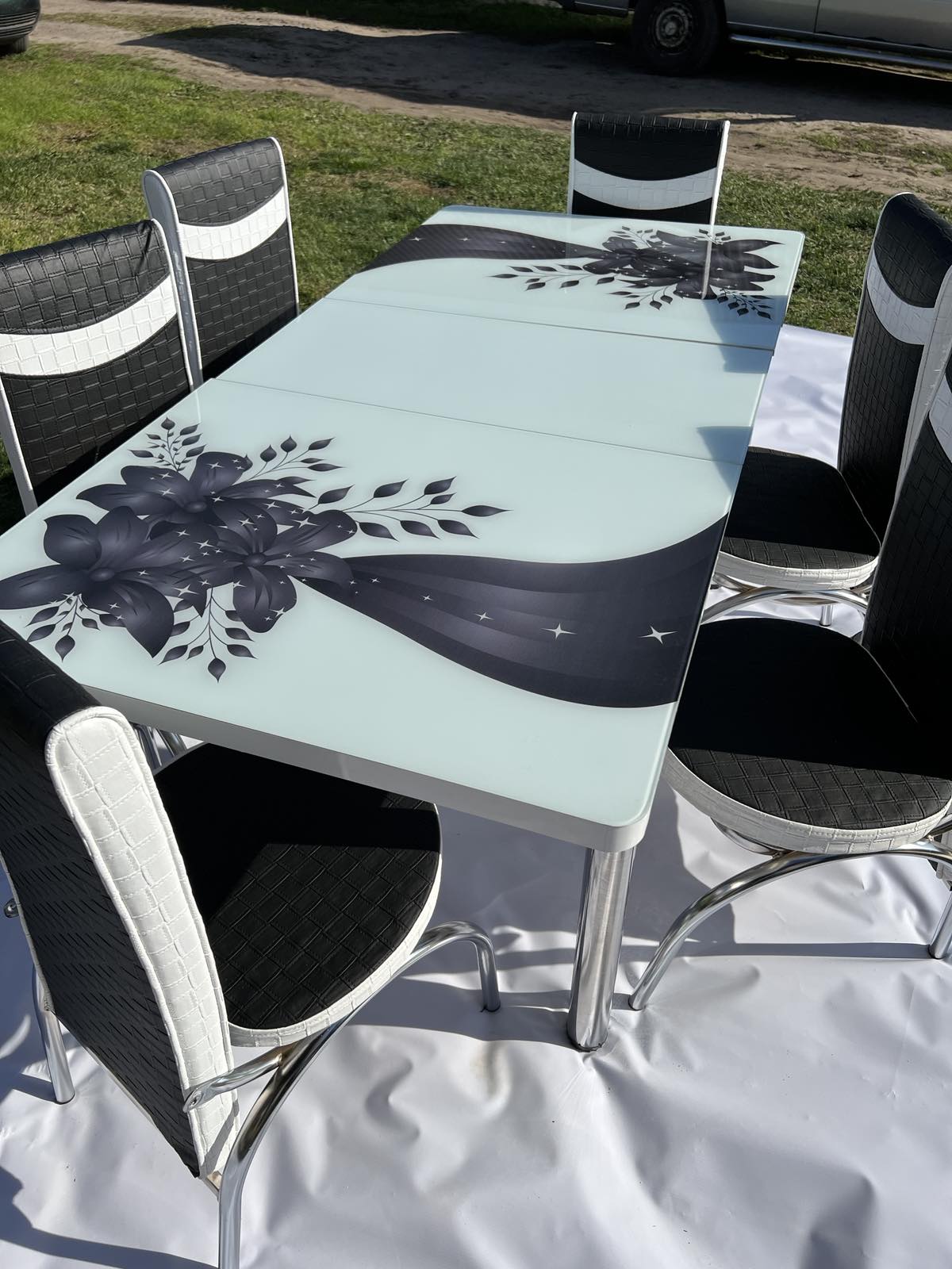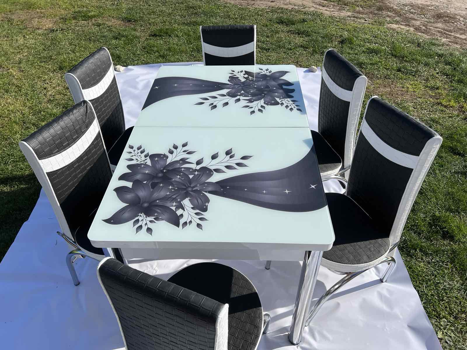 Турецький обідній розкладний 3D стіл та 6 стільців з гартованого скла металевий каркас