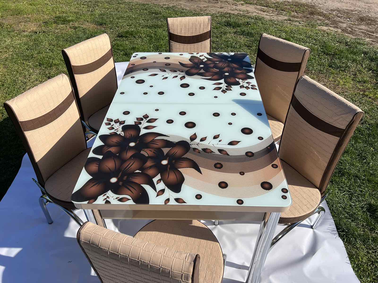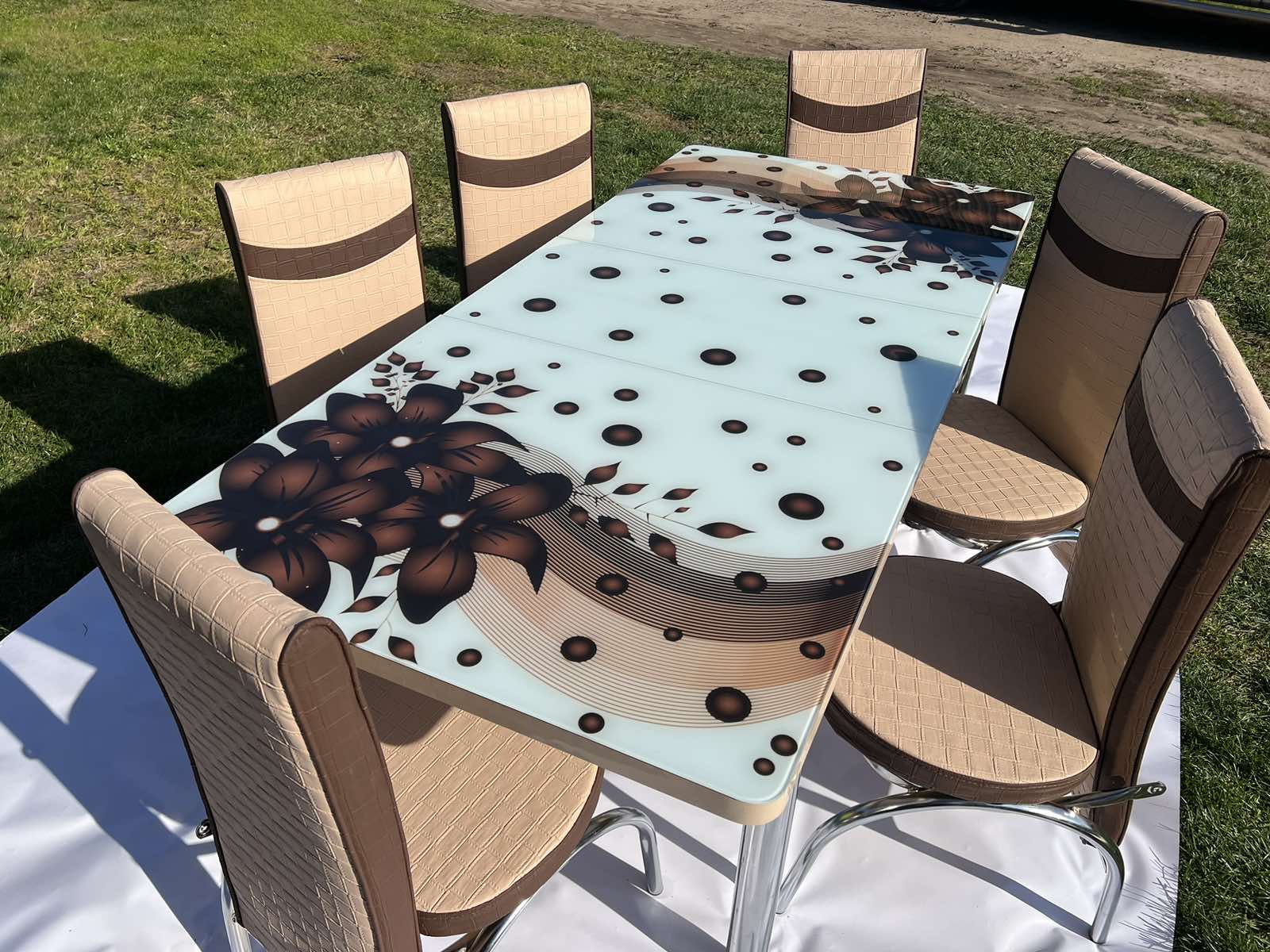 Турецький обідній розкладний 3D стіл та 6 стільців з гартованого скла дерев'яний каркас