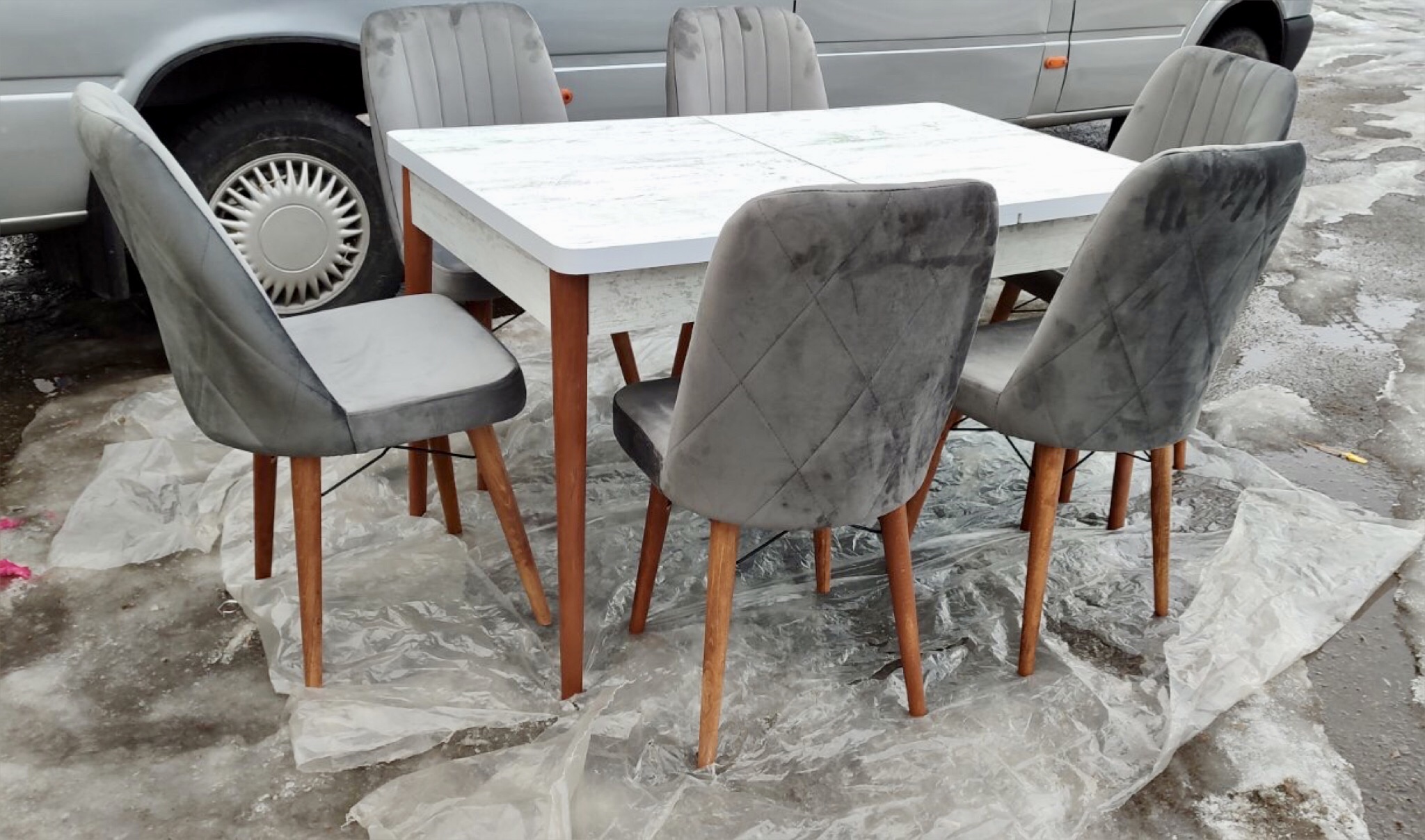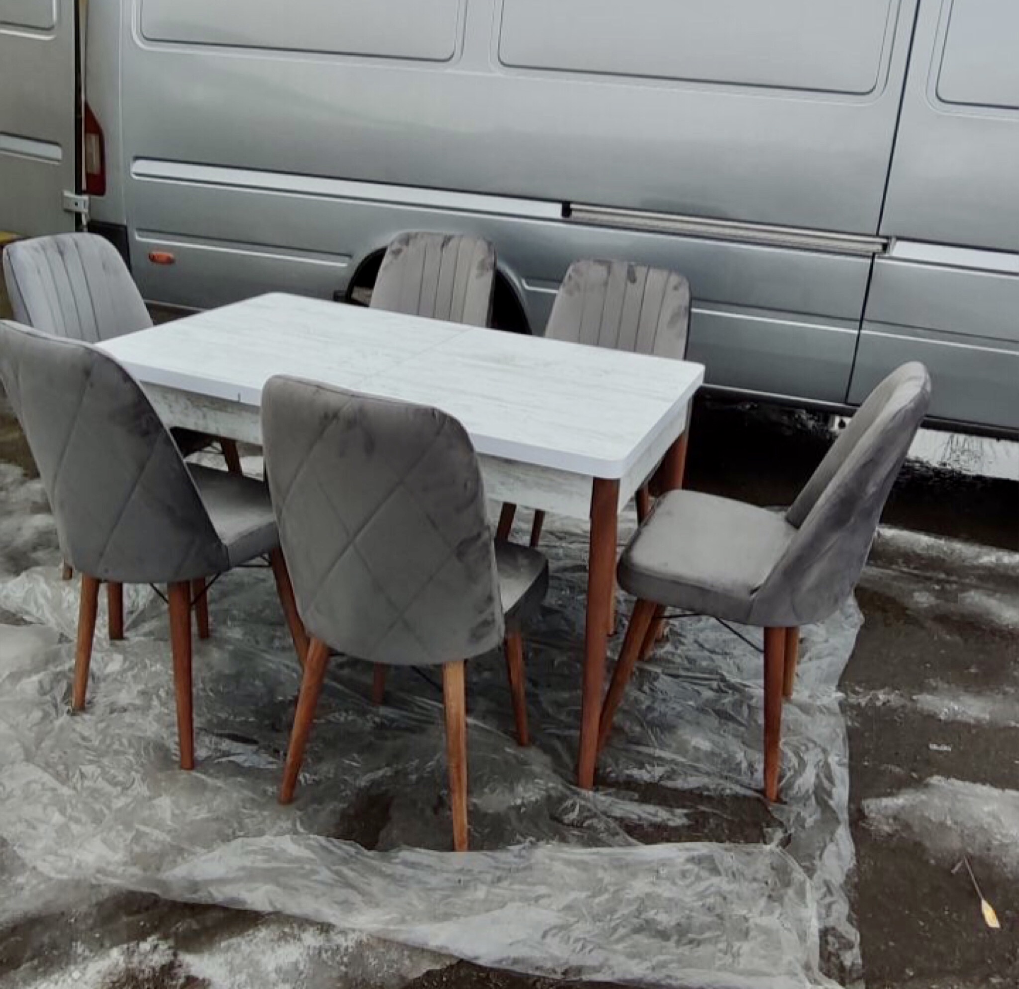 Ніжки столу і стільців дерев'яні, для оббивки стільців використовується високоякісна тканина (велюр-антикіготь).
