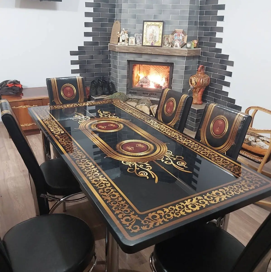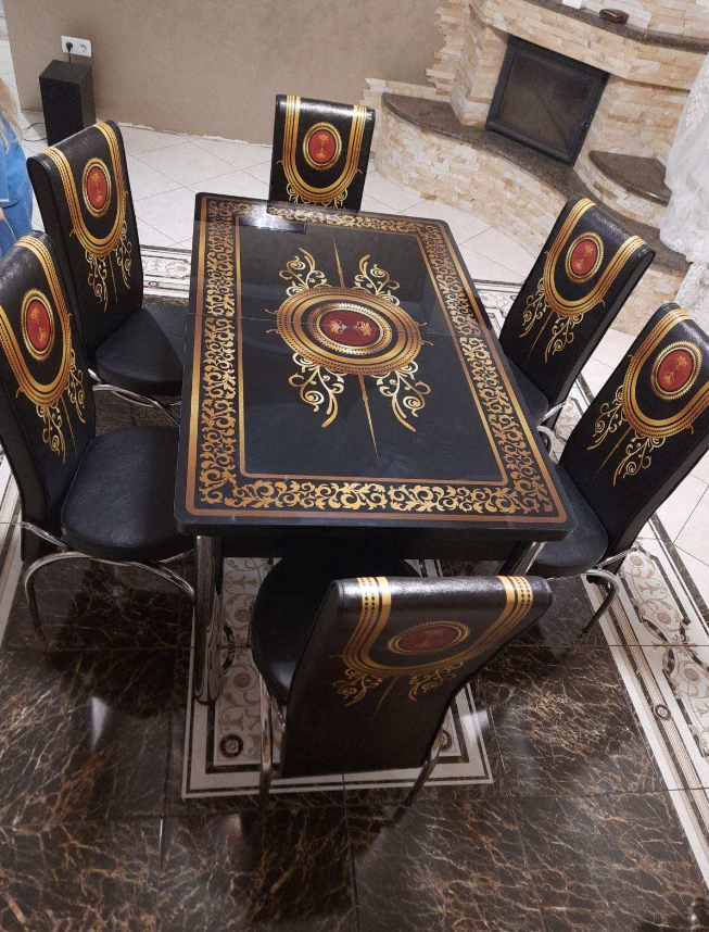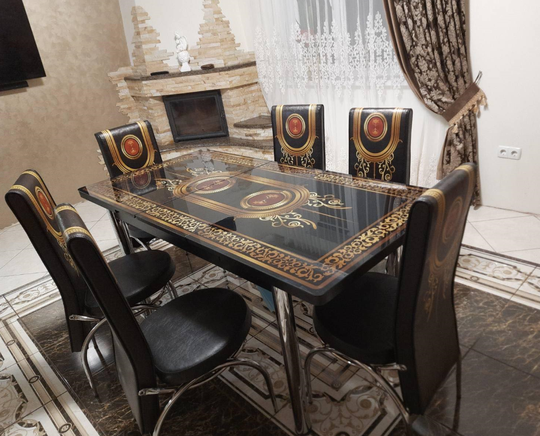 Турецький обідній розкладний 3D стіл та 6 стільців з гартованого скла металевий каркас
