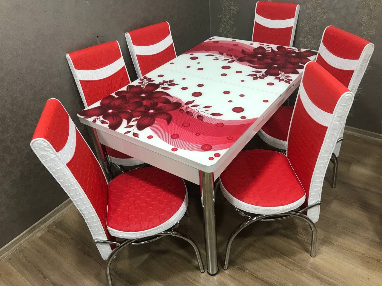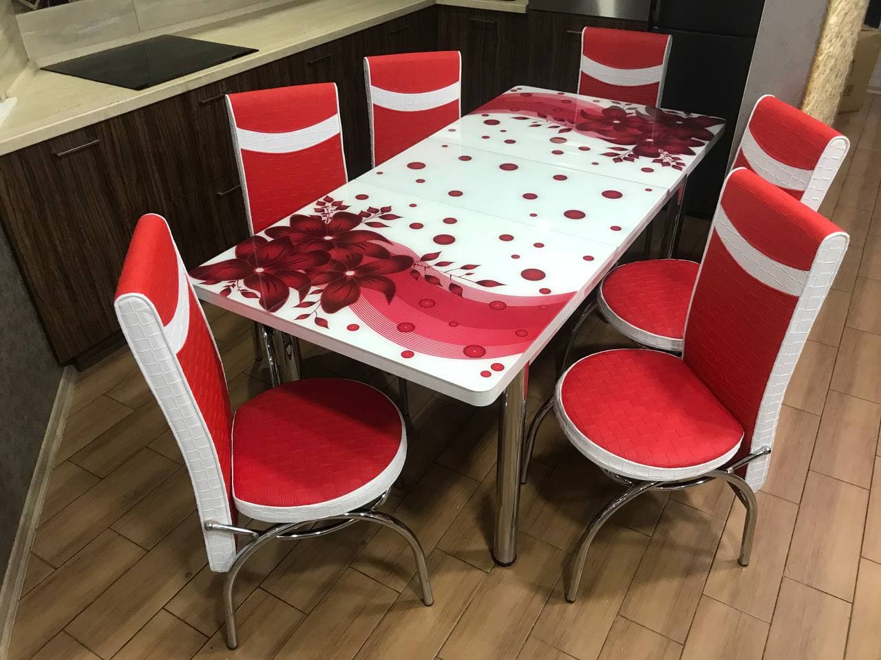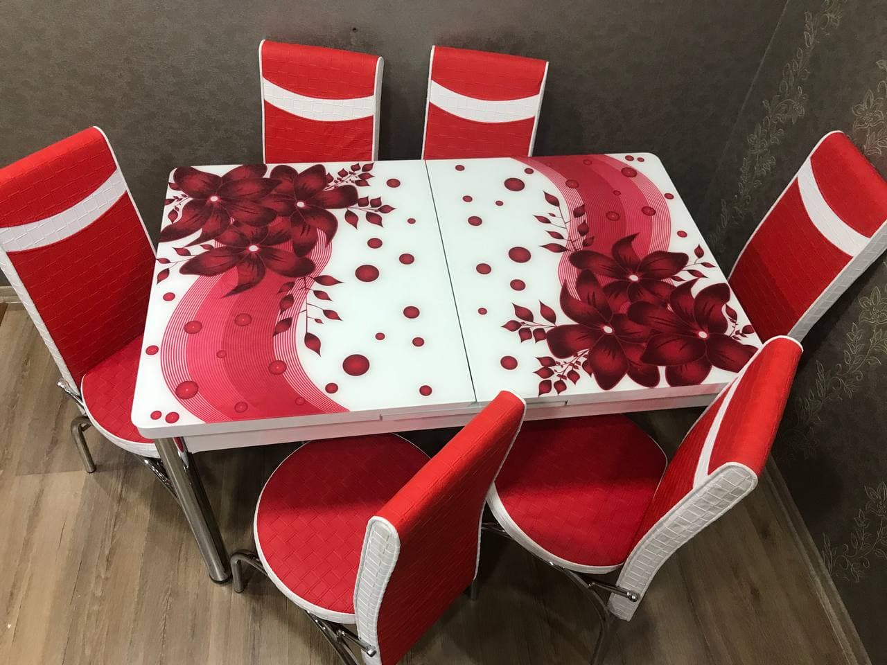 Турецький обідній розсувний 3D стіл на 6 стільців з гартованого скла дерев'яний каркас